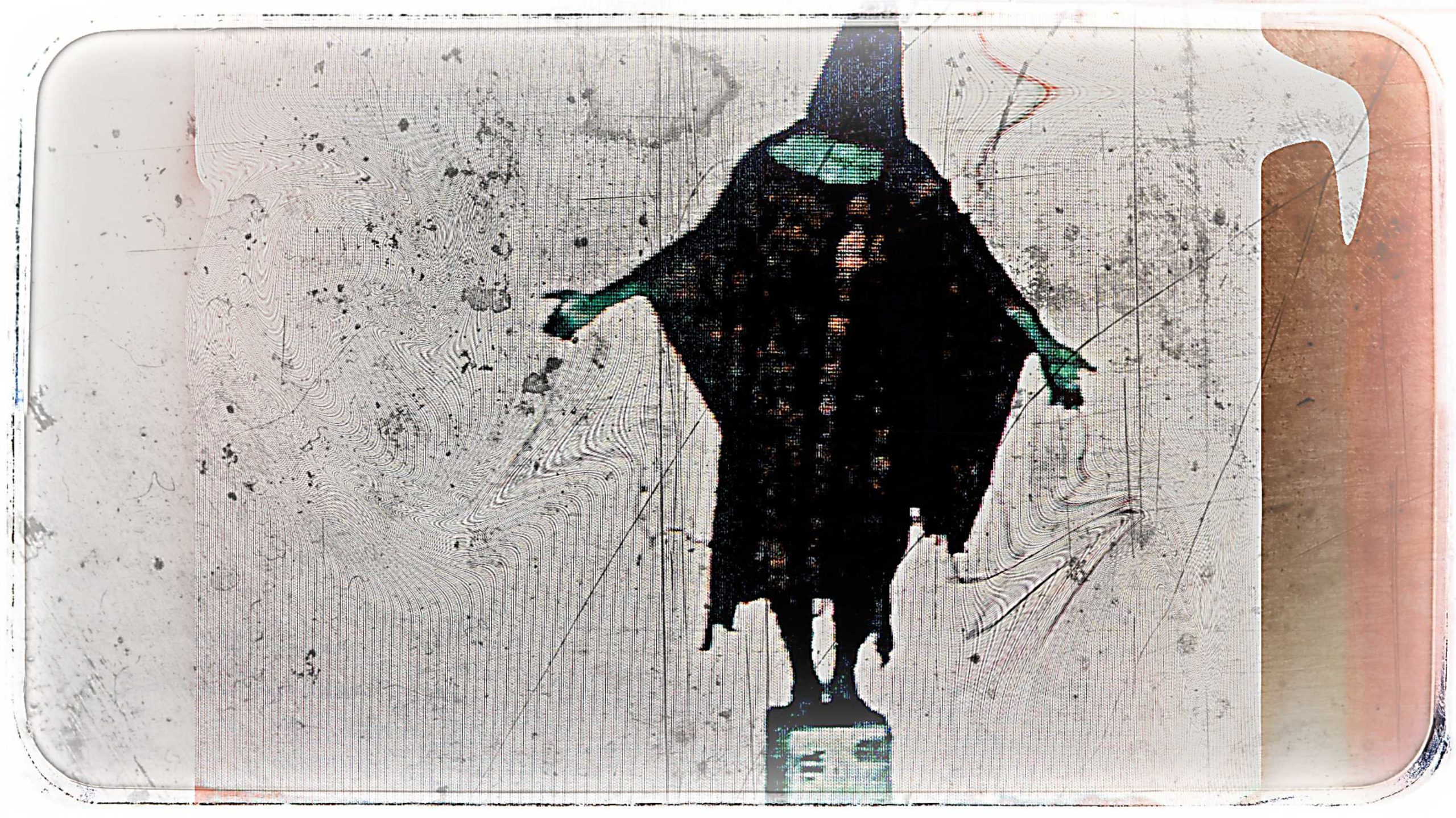 23:01 uur, 4 november 2003. Gedetineerde met zak over zijn hoofd, staand op een kist met draden eraan vastgemaakt. Alle bijschriften zijn rechtstreeks afkomstig uit CID-materiaal. U.S. Army/Criminal Investigation Command (CID). In beslag genomen door de Amerikaanse overheid. Classificatie: De Man met de kap. Dit is een van de foto’s van sergeant Ivan Frederick van de gevangene met de bijnaam Gilligan en later correct geïdentificeerd als Abdou Hussain Saad Faleh, staand op de kist met draden aan zijn linker- en rechterhand. Op een andere foto, die ongeveer drie minuten na de iconische foto met een andere camera werd genomen, staat Frederick rechts van Abdou Hussain Saad Faleh.